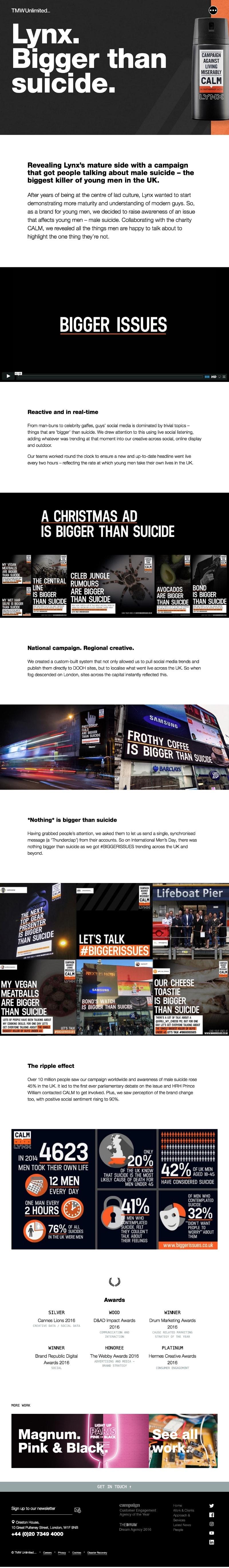 Créer des modules pour cette page n'avait vraiment rien d’ordinaire, comme vous pouvez le voir dans celui montré un peu plus bas. Vous pouvez voir que certaines des valeurs sont optionnelles (comme {% if include.spaced %}), ce qui veut dire que j'ai poussé la personnalisation encore plus loin en ajoutant ou en retirant des classes et du contenu pour donner à la page un caractère encore plus singulier. Avec par exemple l’ajout optionnel d’images dans le module section-image à une colonne égale à la largeur de l’élément .l-container ou à une version un peu plus large via l’utilisation de la classe .l-container--wide. Cette technique a été utilisé avec le plus bel effet sur l’étude de case de Lynx Bigger Issues.